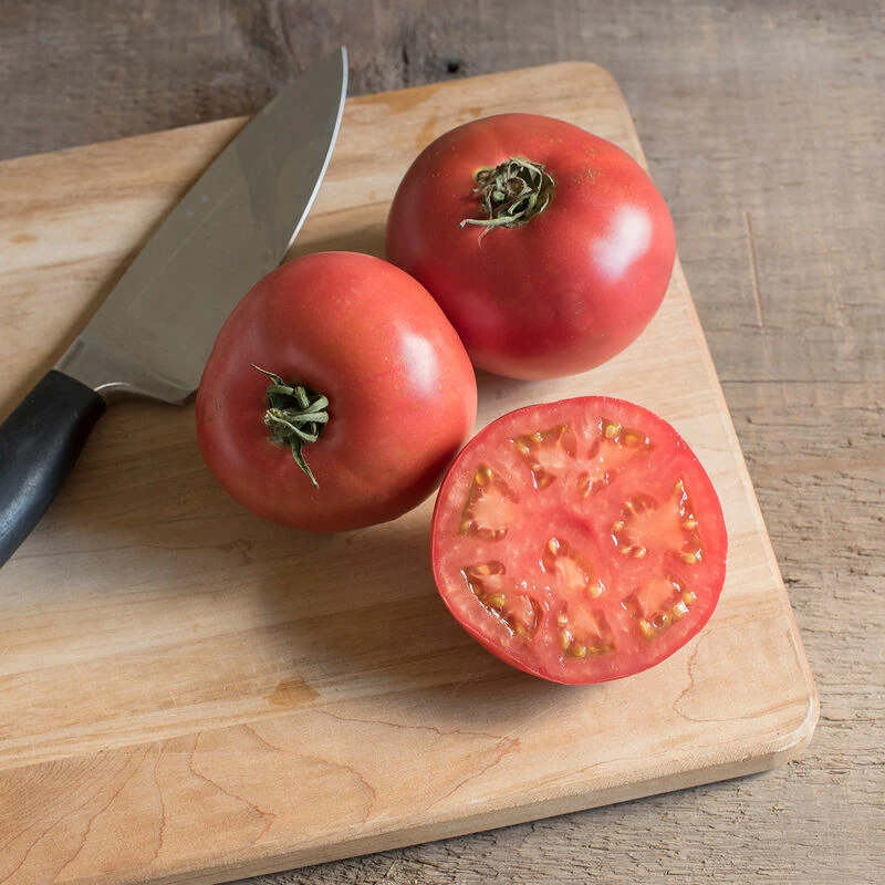 Damsel produces avg. 8–12 oz., globe-shaped fruits with beautiful, pink skin. Shares flavor qualities (sweet, rich, and tangy) with traditional pink heirlooms, such as Brandywine and Pruden’s Purple, but is more resistant to disease. Compact indeterminate plants require minimal pruning. While bred specifically for organic field conditions, it also performs well in the hoophouse. Damsel is the first commercial variety available from independent breeder EarthWork Seeds, who produced the seed in California. Indeterminate. USDA Certified Organic.