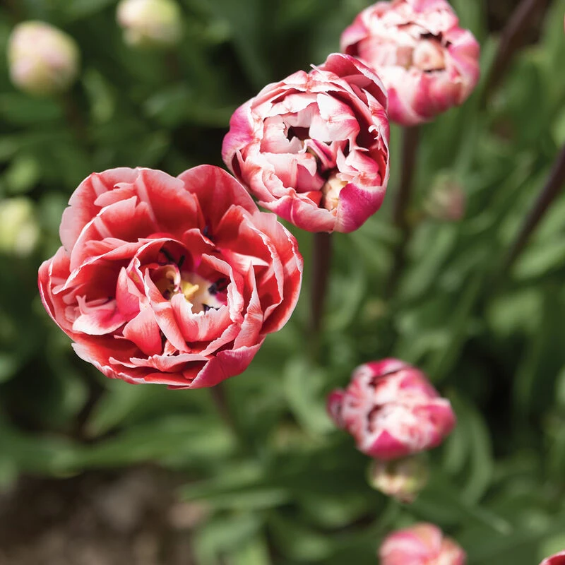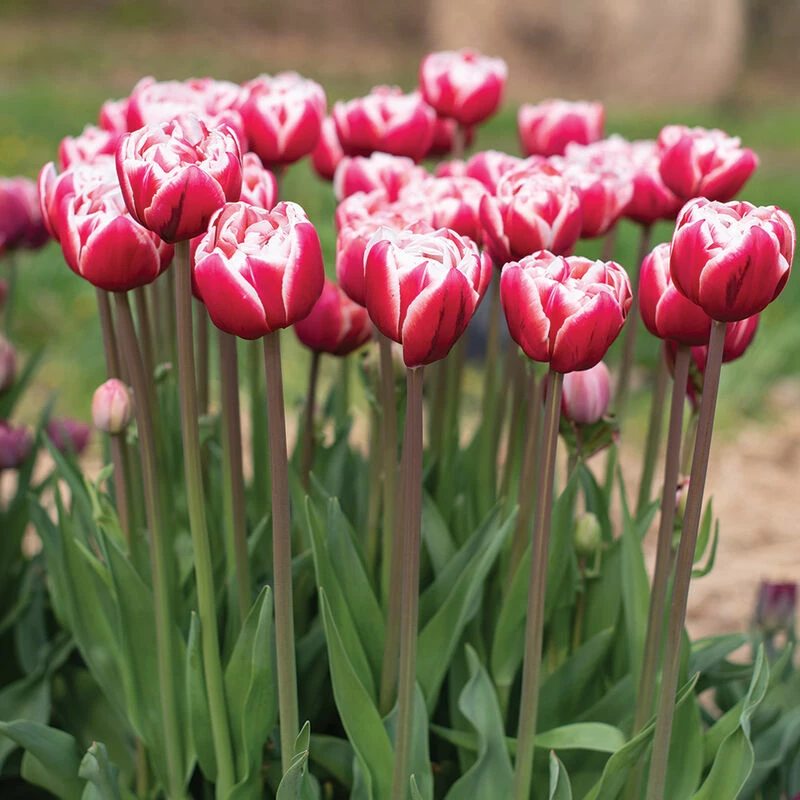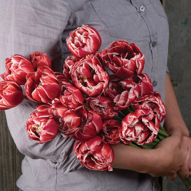 Tall, sturdy, uniform stems. Deep candy apple-red petals with feathery white edges. The 2 1/2–3″ blooms are highly uniform. NOTE: Bulbs do not come pre-chilled; if growing in hardiness Zones 8–10, see growing information (below) for pre-chilling instructions.