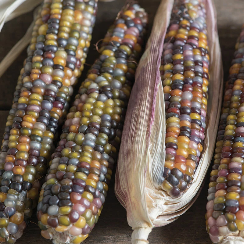 A distinctive presentation in fall displays, the glassy-looking kernels are unique to this variety. Kernels can be popped, but results may vary. Sturdy plants can reach 10′ tall. Avg. ear size 6–8″. Requires a fairly long growing season for favorable yields. Bred by the late Carl Barnes, an Oklahoma Cherokee who dedicated his career to reclaiming and preserving seed of traditional Native American corns.