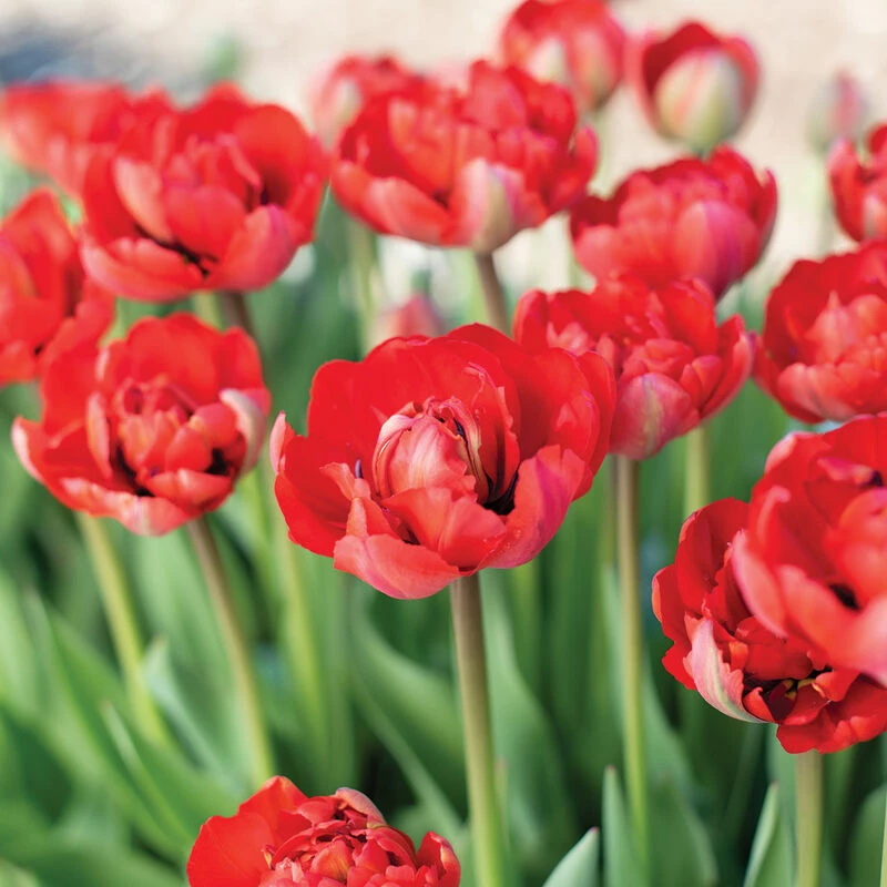 One of the earliest doubles to flower in our trials. Though classified as a Double Late tulip, Miranda’s lineage is from the Darwin Hybrid group, making her early, tall, and uniform. Her round, “pom-pom like” buds open to deep vibrant red, fully double 3″ blooms. NOTE: Bulbs do not come pre-chilled; if growing in hardiness Zones 8–10, see growing information (below) for pre-chilling instructions.
