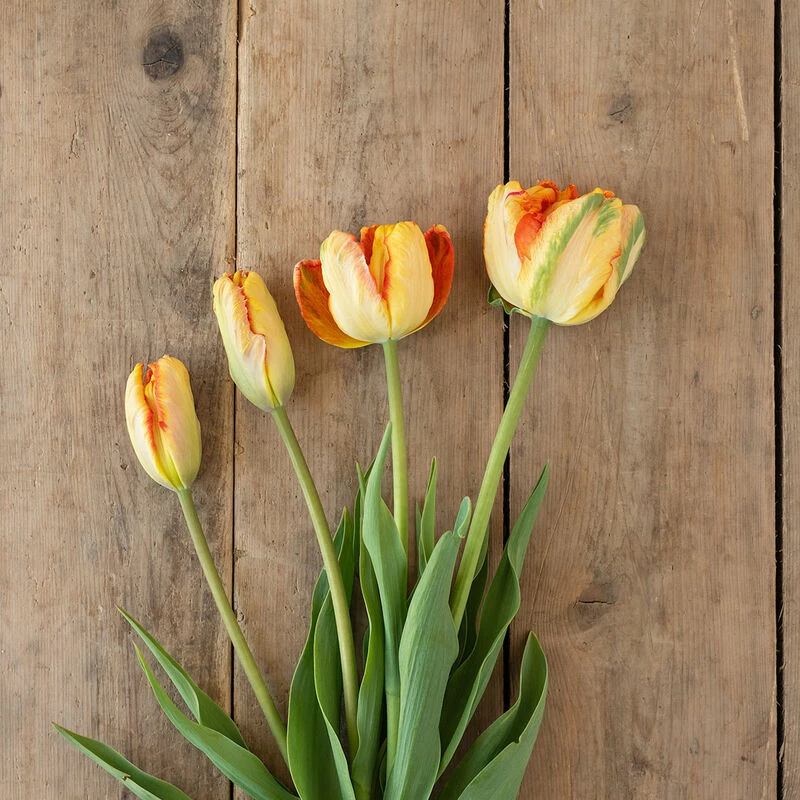 3–3 1/2″ blooms with striking colors and intricate patterning. Petals in apricot and orange hues with gold, green, and cream shades that appear painted on in delicate detail. Feathery petals are nicely scalloped and crimped. NOTE: Bulbs do not come pre-chilled; if growing in hardiness Zones 8–10, see growing information (below) for pre-chilling instructions.