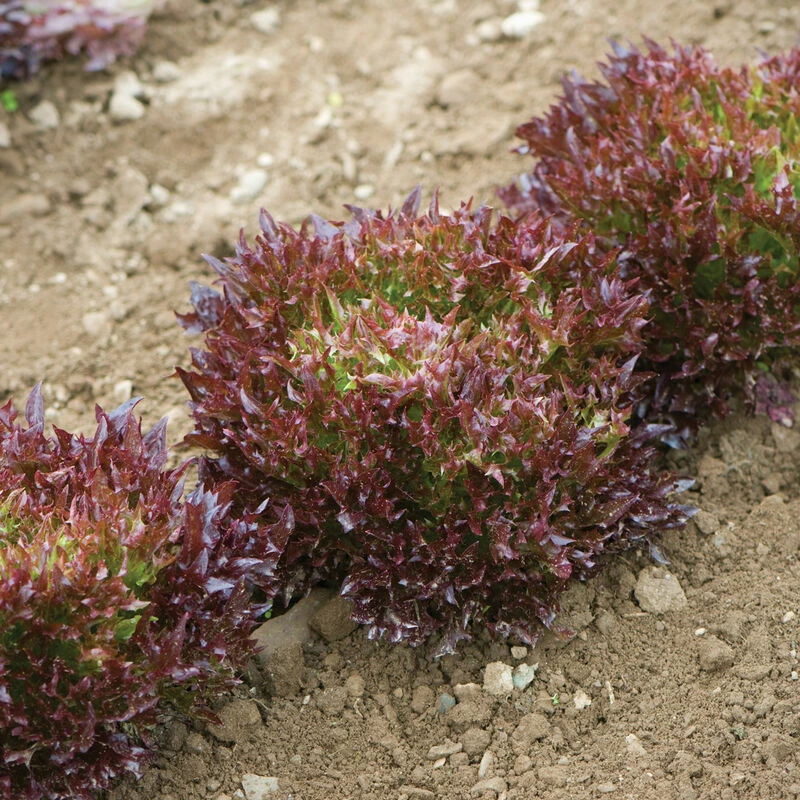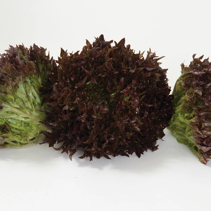 Double red leaves with a very defined, three-dimensional shape. Sweet, almost romaine-like flavor, with a crisp, almost iceberg-like texture. Large, heavy heads are slow to bolt. Suitable for mechanical harvesting. MT0-30. Pelleted seed.